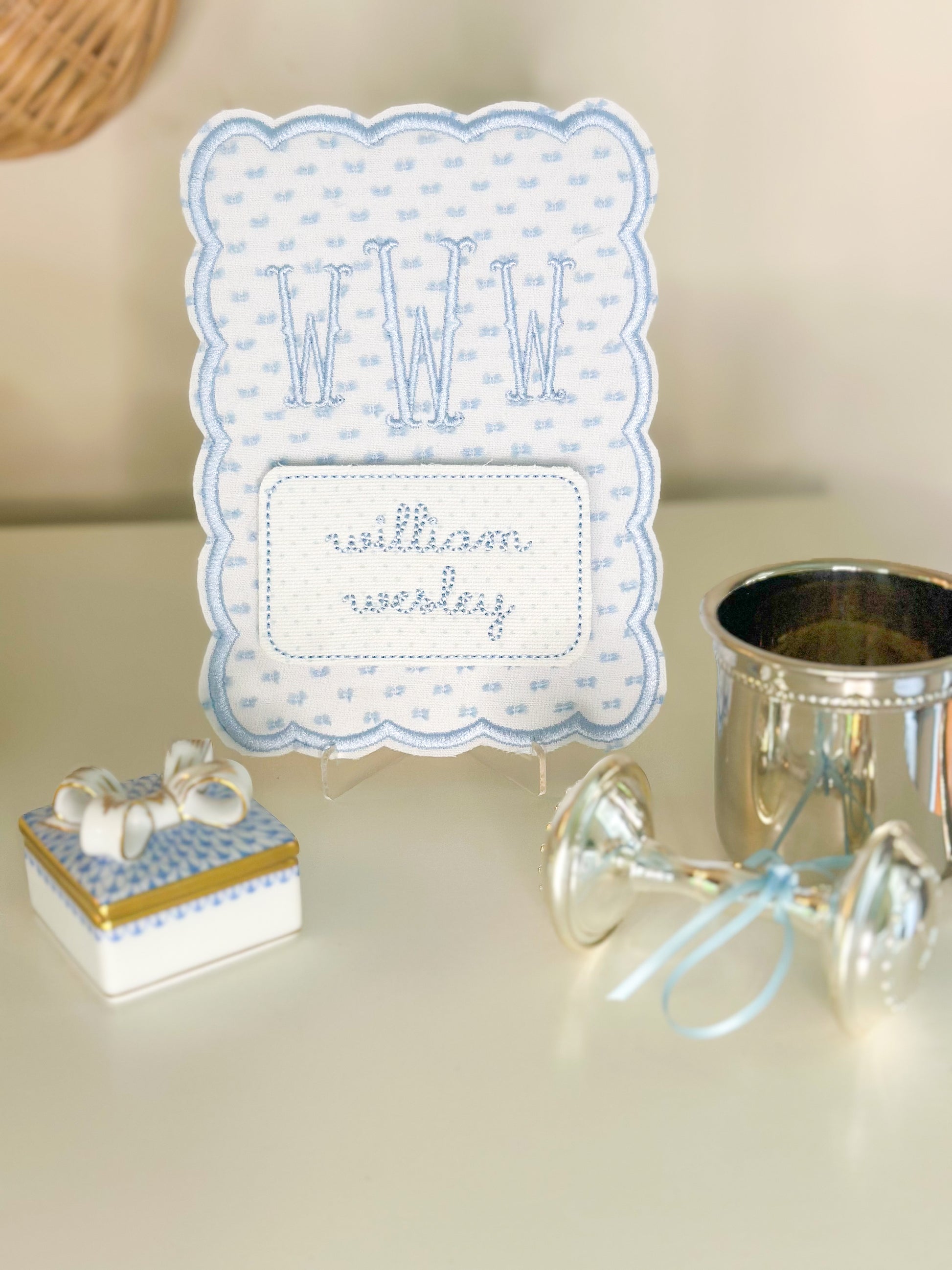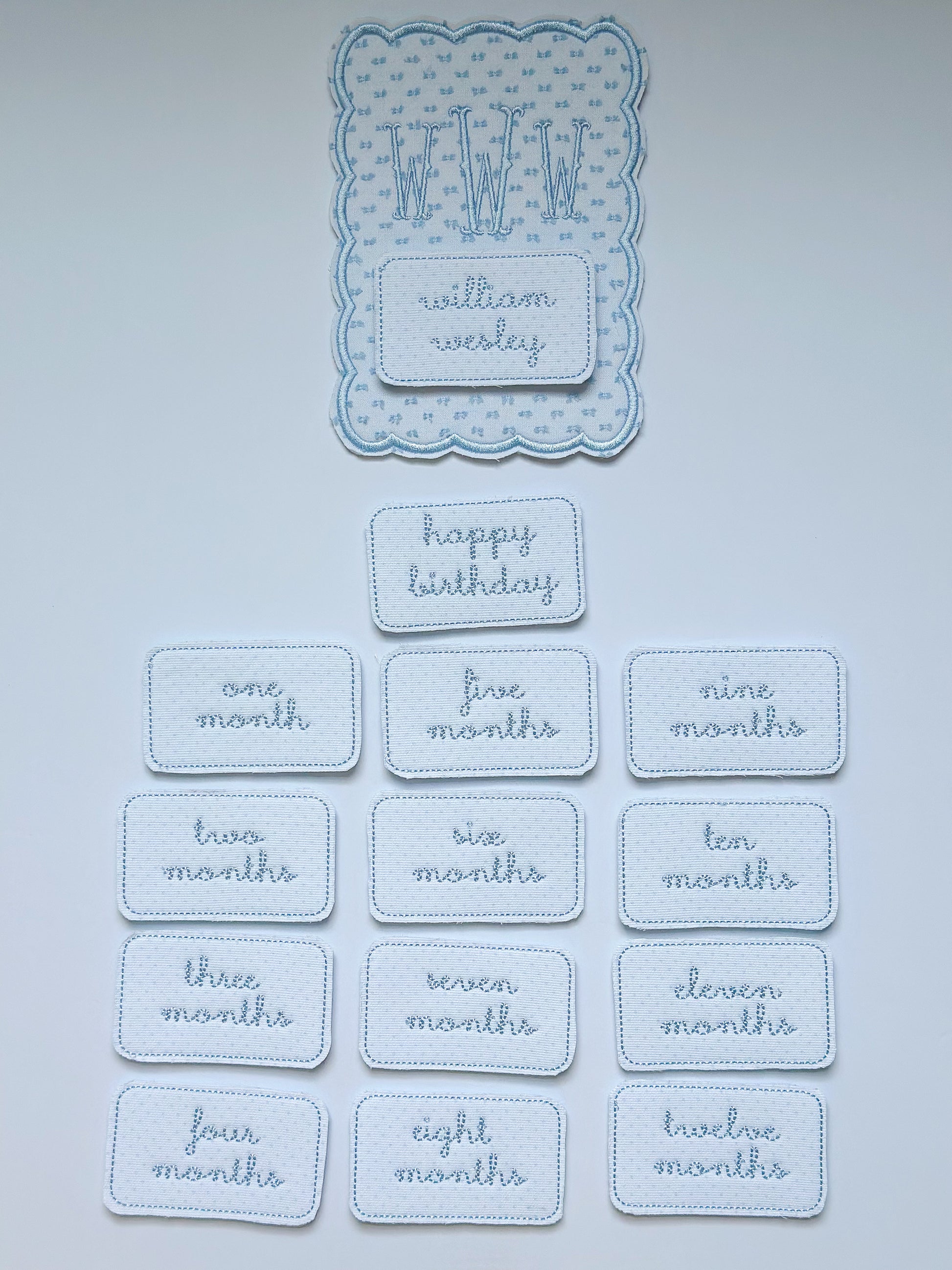 The embroidered monthly milestone cards are a classic way to document your baby through the first year of life. You will receive 14 mini cards to change out monthly - one for each month, “happy birthday”, and a name card. These give you the option to use them for years to come. You will also receive an acrylic easel and a small box to store the unused cards in so you can display them in the nursery!