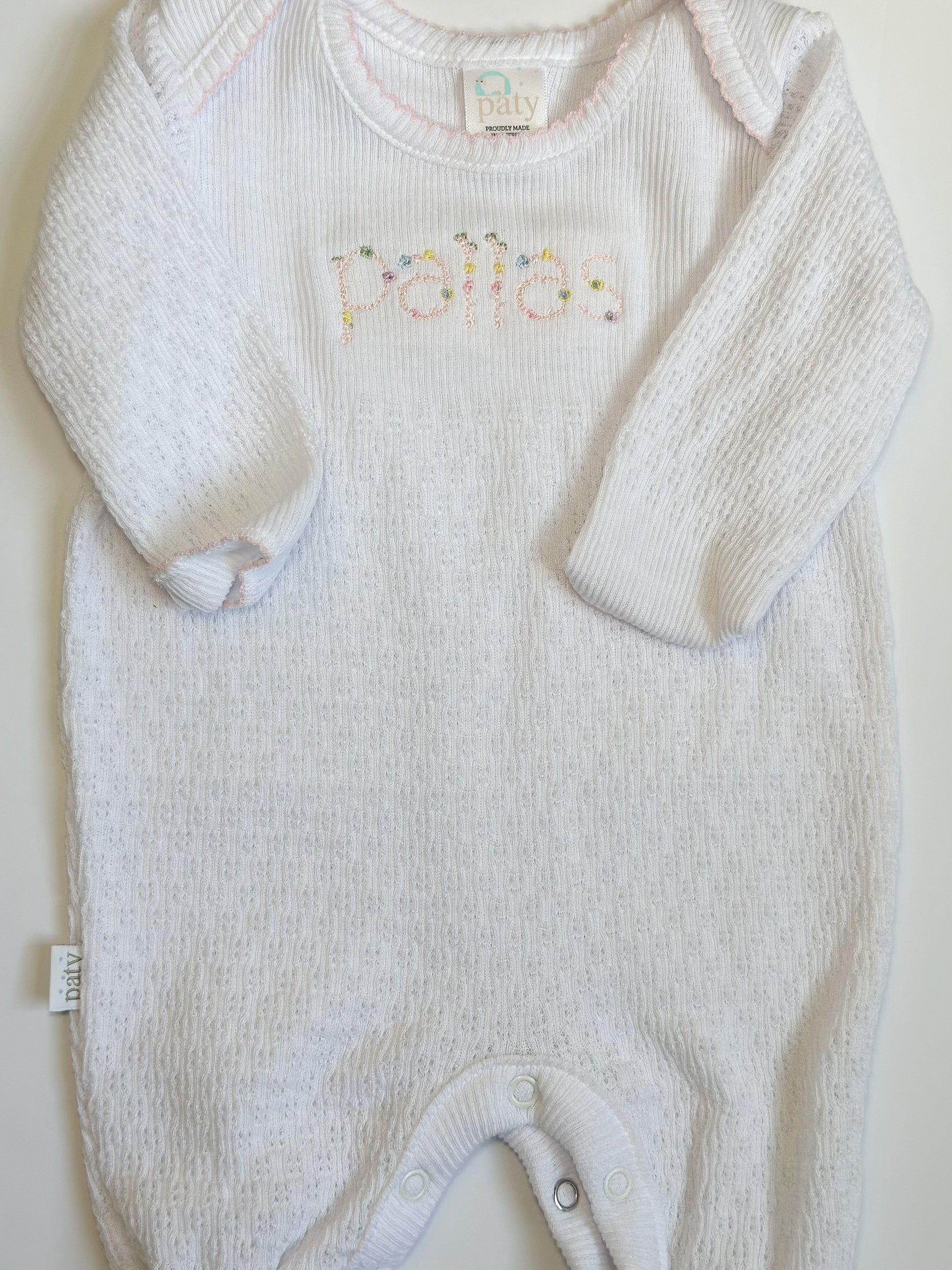 These rompers are the sweetest for newborns and infants. They have a sweet lap over on the shoulder and the trim in pink or blue.