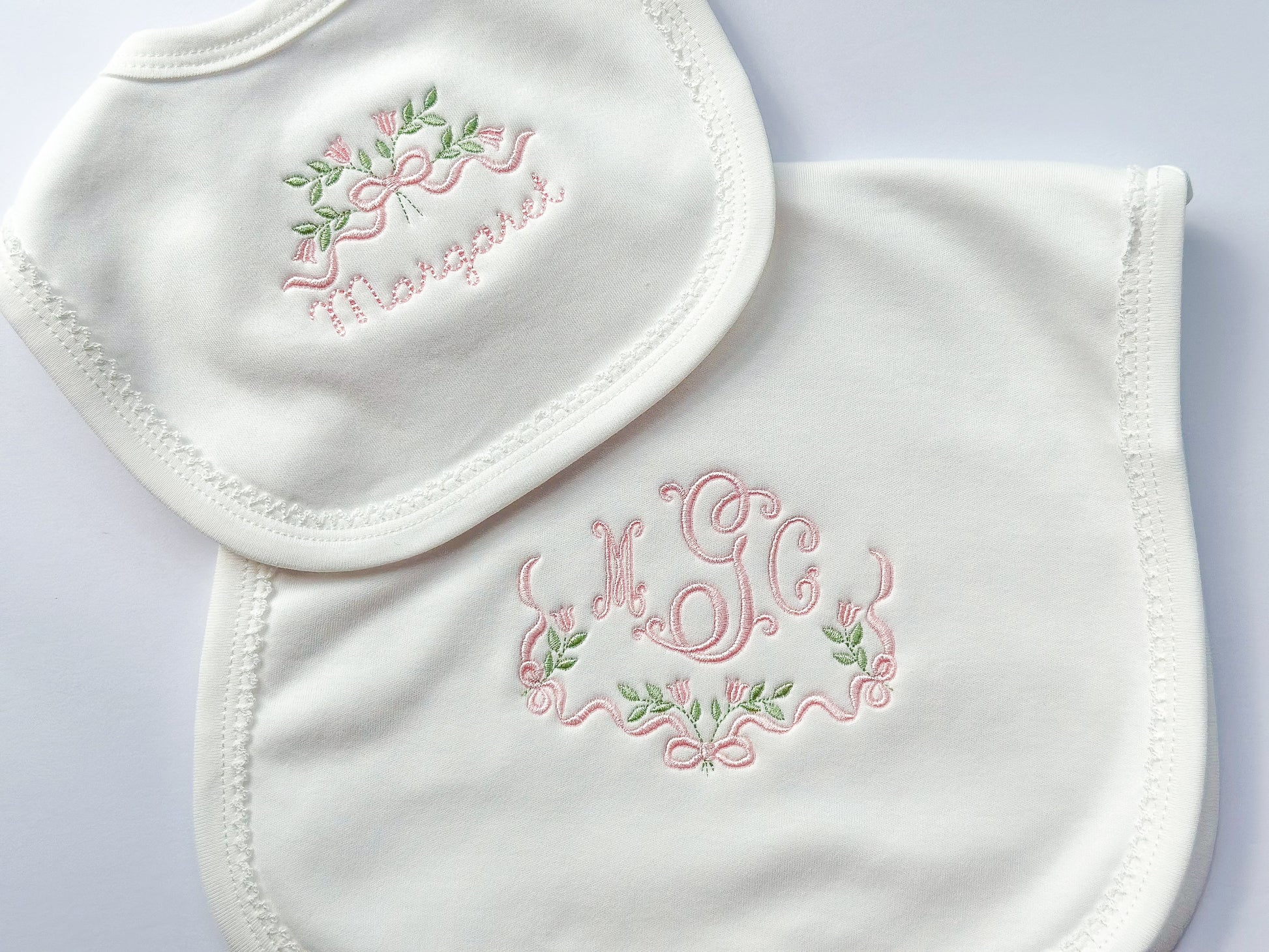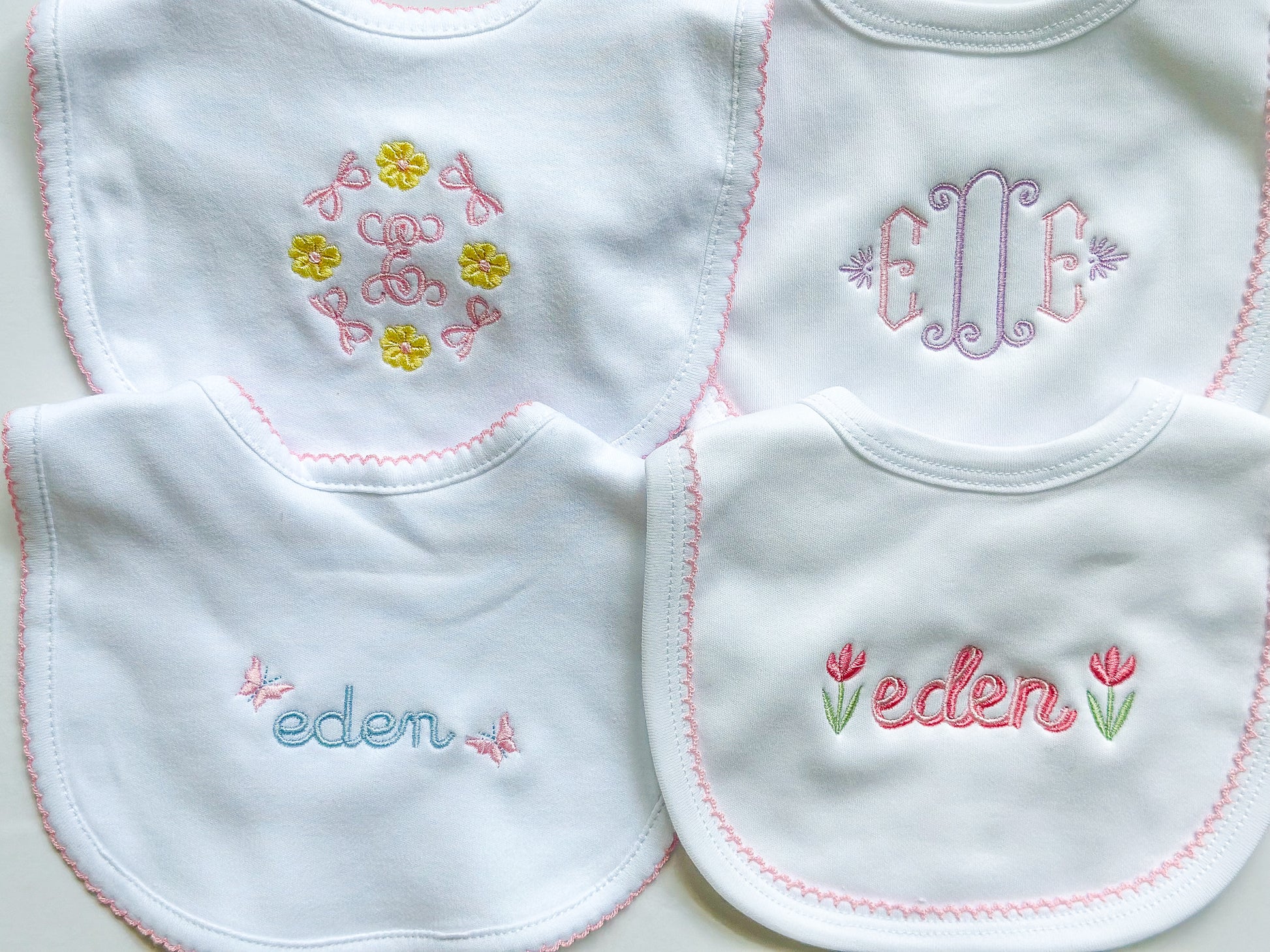 The perfect bib with a snap in the back. These are so soft and so cute with a monogram! These will vary in brands but are all pima cotton with trim.