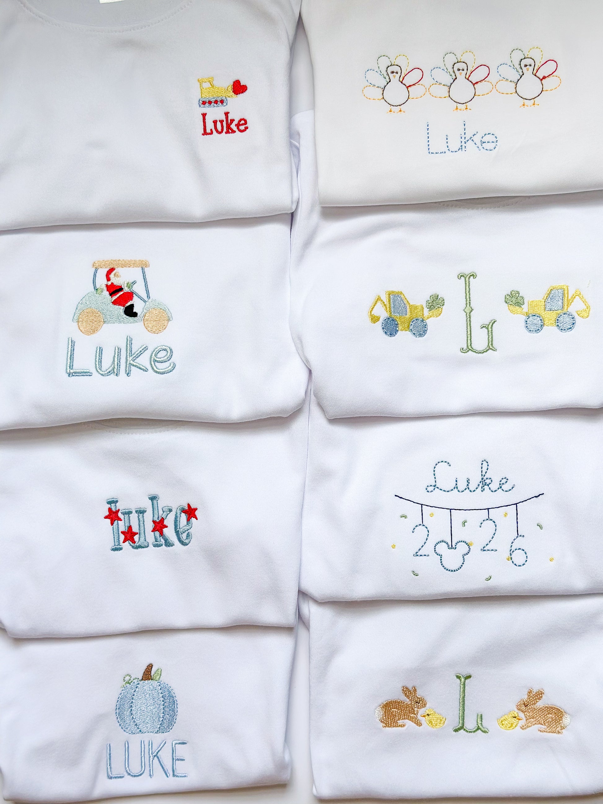 This large bundle covers every holiday! You will get 8 shirts - one for each holiday. These work the same way as the regular t-shirt bundles. You tell me sizes, name/initials, and some favorites (or things to avoid) and I take it from there. This ensures your kiddo looks cute all year long with virtually no effort on your end!